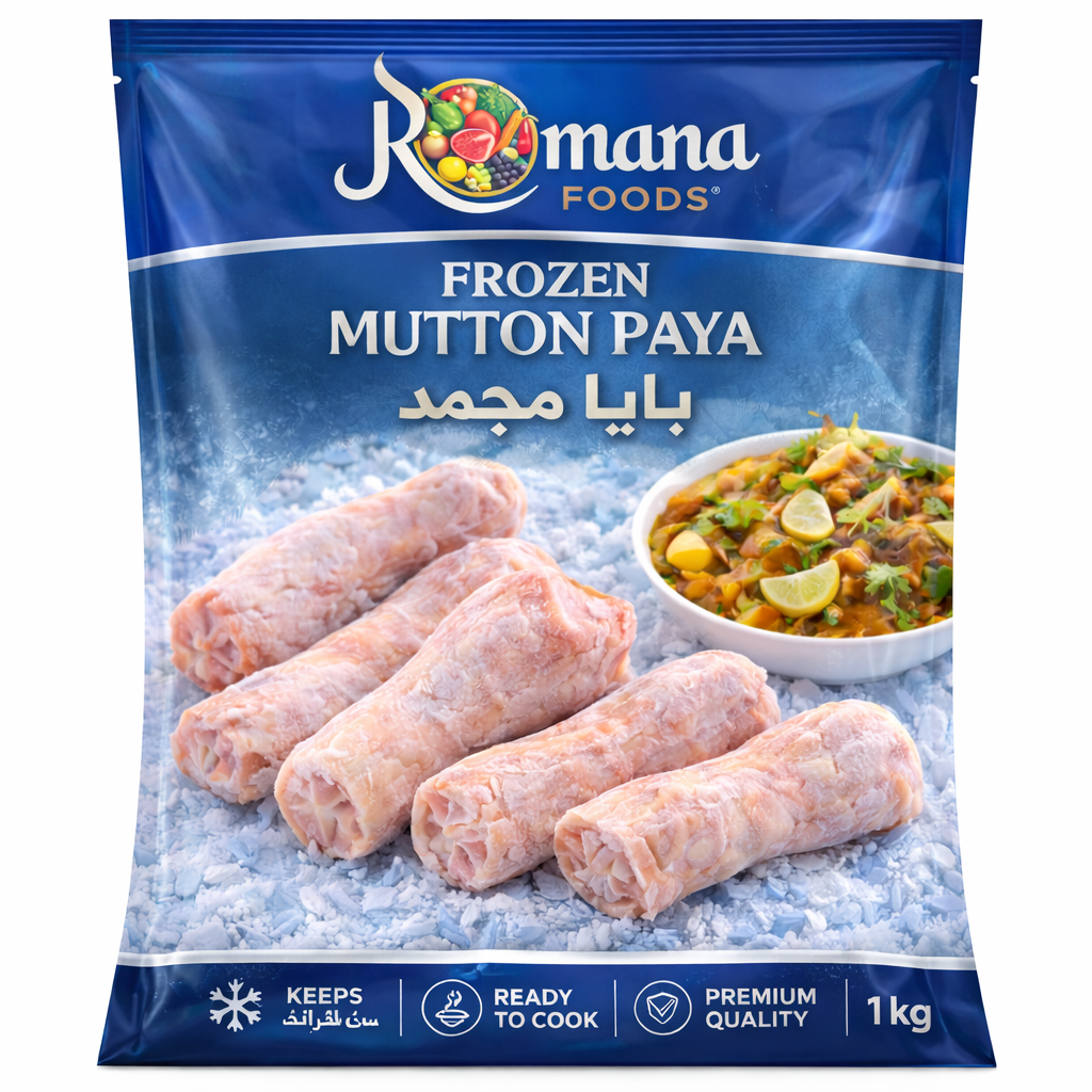 Enjoy authentic taste and rich nutrition with Romana Foods Frozen Mutton Paya, carefully cleaned and hygienically processed to deliver traditional flavor and superior quality. The paya is quick-frozen to lock in freshness, natural taste, and nutrients, making it ideal for slow-cooked and traditional recipes.